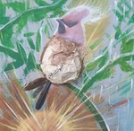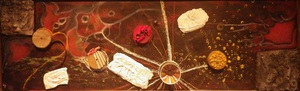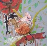 2011Meeuwen aan zee uitgangspunt was kat (Roxy) en vogel (Dotie), puur wat me op dat moment bezig hield en toen viel ik in deze chaos van kleuren en materialen (stuk hout) het kwam zoals het kwam die dag! Titel is bedacht naar aanleiding van het resultaat van het schilderij.