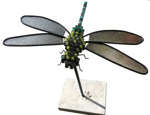 2019De voorstelling is een herinnering aan mijn kat Singha,haar eerste prooi was een gewone oever libelle. Gemaakt van glas( fussen) en metaal op een paal van staal in beton gegoten.