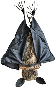2020De vleerhond: vanuit het houtblok met ingegroeide ketting zag ik de vorm al voor me een vleerhond moest het worden. In Indonesie heb ik dit bijzondere dier voor het echt mogen bekijken in de natuur tijdens een bootocht.